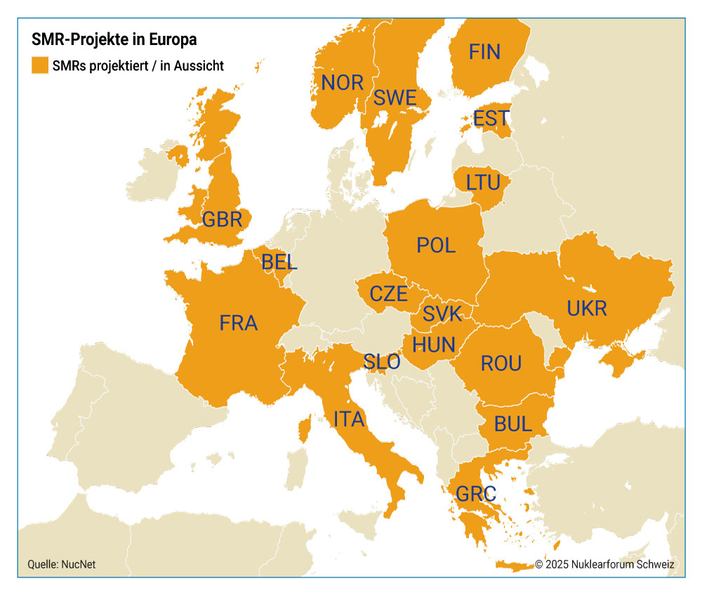 SMRs werden in den nationalen Energieplänen vieler europäischer Länder zunehmend als strategische Ergänzung zur grosstechnischen Kernenergie positioniert. Einige Länder wie Estland oder Norwegen erwägen SMRs, um damit erstmals in die kommerzielle Kernenergienutzung einzusteigen.
