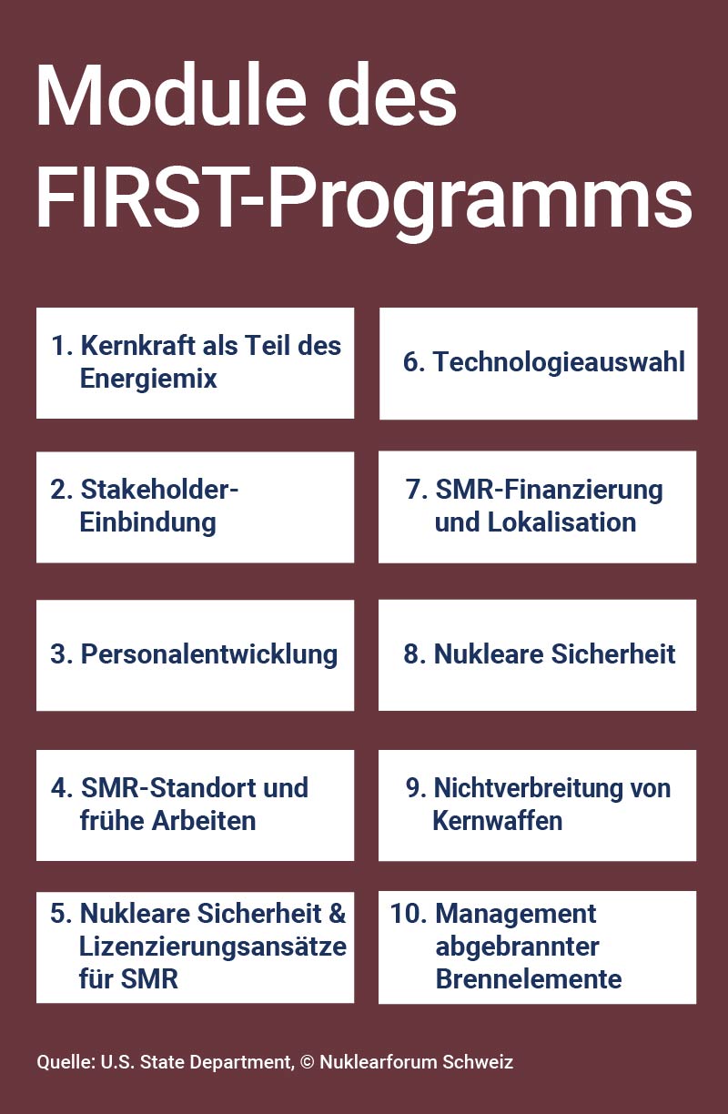 Das FIRST-Programm ist Teil der Bemühungen der USA, die Klimakrise anzugehen und globale Zusammenarbeit zu fördern. Die Regierung investiert USD 5,3 Mio. in das Programm und bietet ein aus zehn Modulen bestehendes kollaboratives Schulungs- und Kapazitätsaufbauprogramm an. Das Programm nutzt die mehr als 60-jährige Erfahrung und Expertise der USA in der Kernenergie. Dabei werden die spezifischen Bedürfnisse der Partnerländer berücksichtigt und Experten aus verschiedenen Bereichen wie der Wissenschaft, Industrie, Nichtregierungsorganisationen und nationalen Labors hinzugezogen. Das Ziel von FIRST ist es, durch technische Zusammenarbeit die Entwicklung der nuklearen Infrastruktur aufzubauen, um spezifische Probleme beim Einsatz von SMR anzugehen und eine Grundlage für die weitere bilaterale Zusammenarbeit im Bereich der Kernenergie zu schaffen. Denn im Gegenzug erhoffen sich die USA Exportmöglichkeiten für die Nuklearindustrie in die Partnerländer. Einige amerikanische Unternehmen arbeiten derzeit an der Entwicklung von SMR-Reaktoren, wie zum Beispiel NuScale und das von Bill Gates gegründete TerraPower.