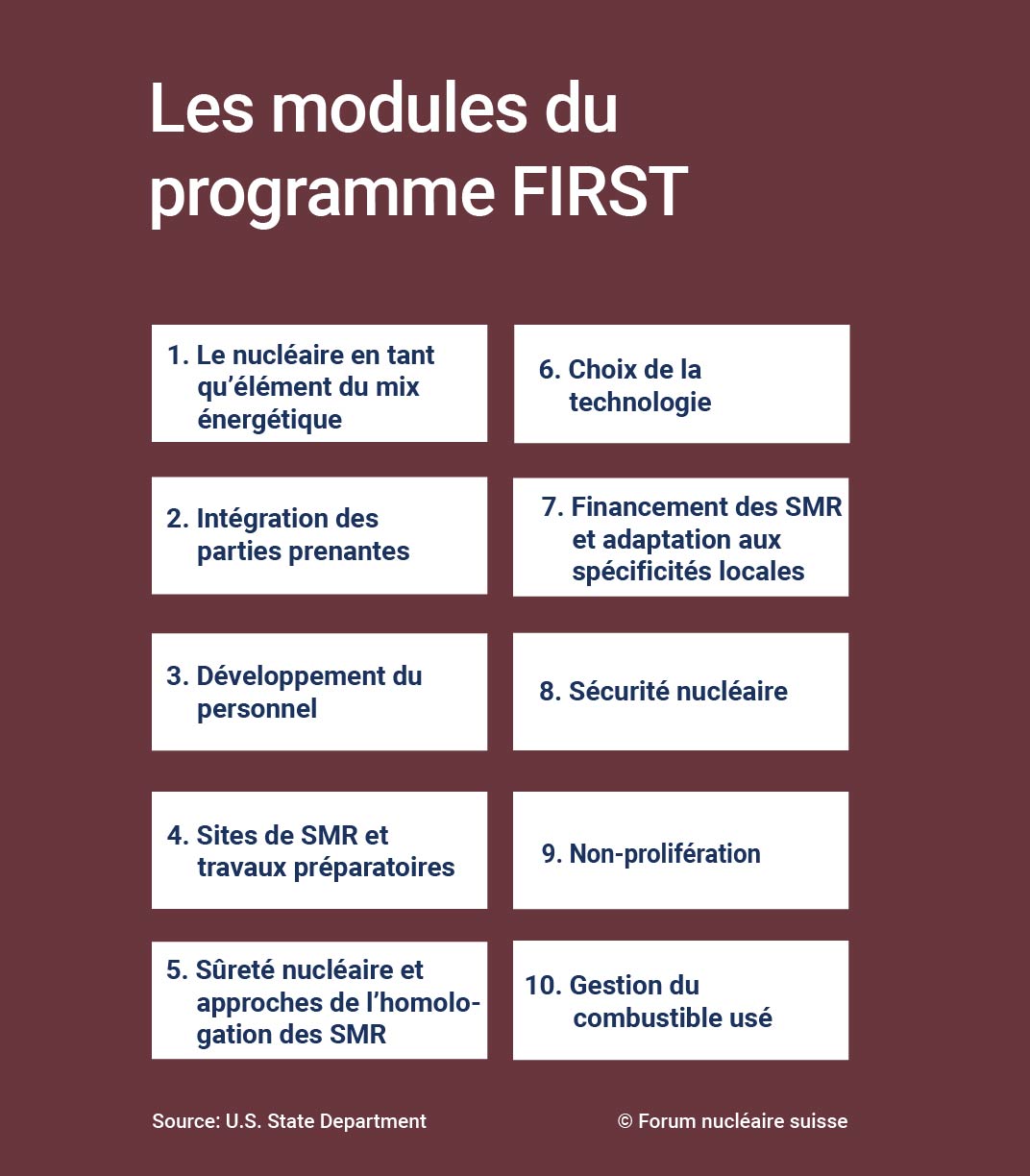 Le programme FIRST s’inscrit dans le cadre des efforts déployés par les États-Unis pour maîtriser la crise climatique et promouvoir la coopération mondiale. Le gouvernement a débloqué 5,3 millions de dollars pour ce programme collaboratif de formation et de renforcement des capacités. Composé de dix modules, le programme FIRST s’appuie sur les plus de 60 ans d’expérience que comptent les États-Unis dans le domaine de l’énergie nucléaire. Il permet de faire appel à des experts de différents domaines (science, industrie, ONG, laboratoires nationaux) afin de répondre aux besoins spécifiques des pays partenaires.